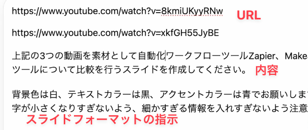 1. 情報源の指定: プレゼンテーションの元となる複数のYouTube動画URLやウェブ記事のURL、またはテキスト情報をGenSparkに入力します。海外の情報であっても、Gensparkは内容を深く理解し、分析します。