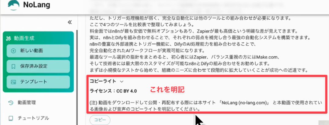 NoLangは商用利用も可能ですが、生成された動画には著作権表示が義務付けられています。利用者は、公開または再配布の際に、指定されたコピーライト表示を適切に行う必要があります。詳細については、Nolangのサポートデスクで提供されている情報を確認することが重要です。また、生成後の動画は管理画面からスクリプトの修正や台本の編集ができるため、細かなニュアンスの調整や誤りの修正も容易に行えます。
