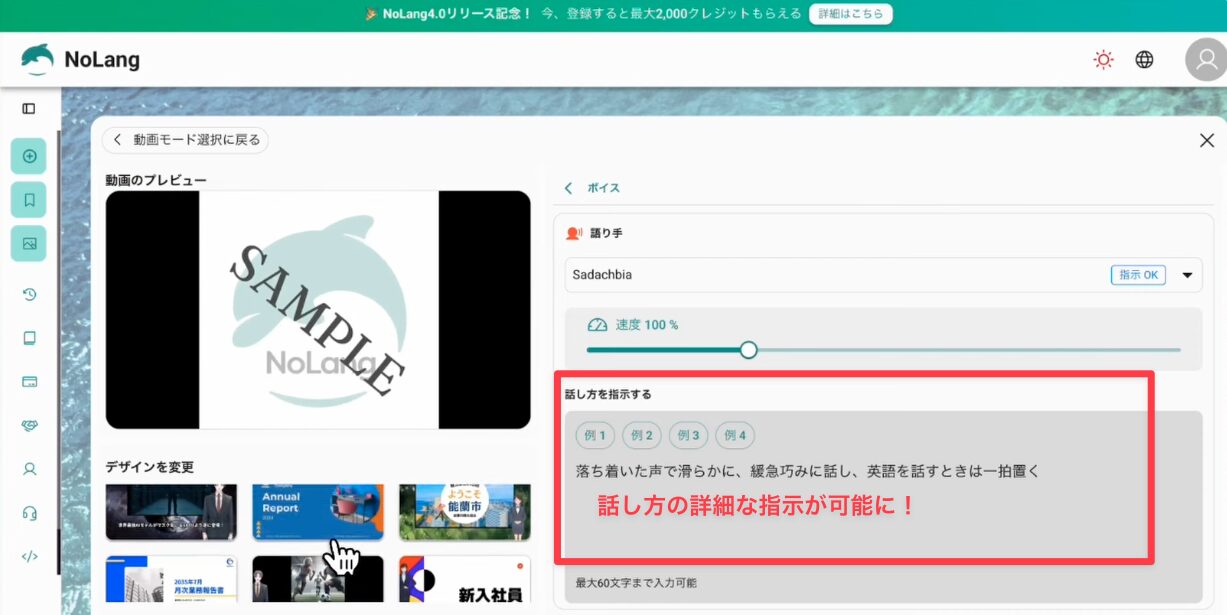 NoLangが生成するプレゼンテーション動画は、その品質の高さと進化の速さに目を見張るものがあります。以前のバージョンでは、音声選択肢が限定的であったり、話し方が単調であったりする課題もありましたが、最新バージョン(4.0)では劇的な改善が見られます。
