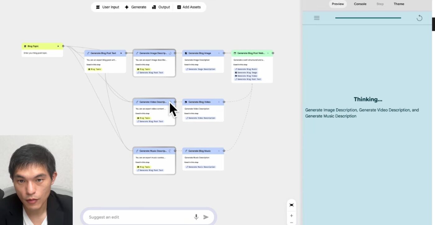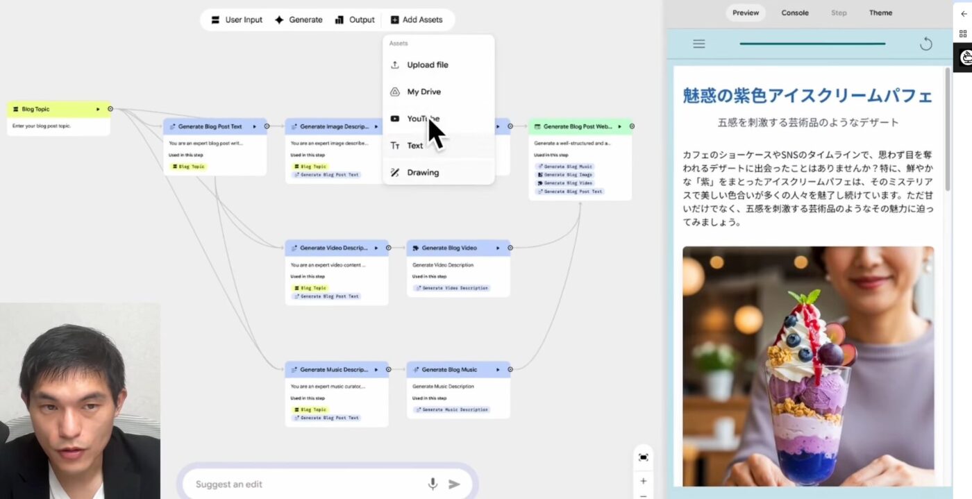実際にOpalを使ってワークフローを構築する流れは非常にシンプルです。Googleアカウントでログイン後、新しいワークフロー作成画面で、実現したい内容を自然言語で入力するだけ。例えば、「デザートの紹介をするブログを書くアプリを作って」といった具体的な指示が可能です。