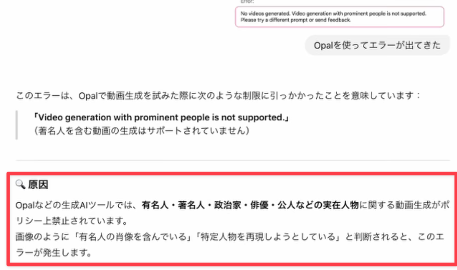 Opalは画像や動画の生成も得意としていますが、利用規約上の注意点も存在します。動画のデモンストレーションでは、当初「アイスクリームパフェを食べているアインシュタイン」の動画生成を試みましたが、著名人の画像を直接生成することには制限があることが判明しました。このような場合、プロンプトを「ポニーテールの美女」のように調整することで、スムーズなコンテンツ生成が可能になります。