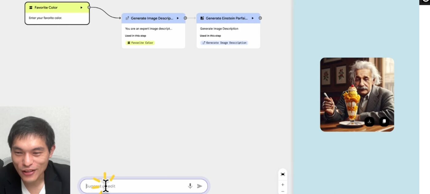 - 自然言語で希望のAIアプリを記述する: 会話形式で、作りたいAIアプリの機能や達成したい目的を具体的に入力します。OpalのAIがこれを解釈し、ワークフローを自動生成します。