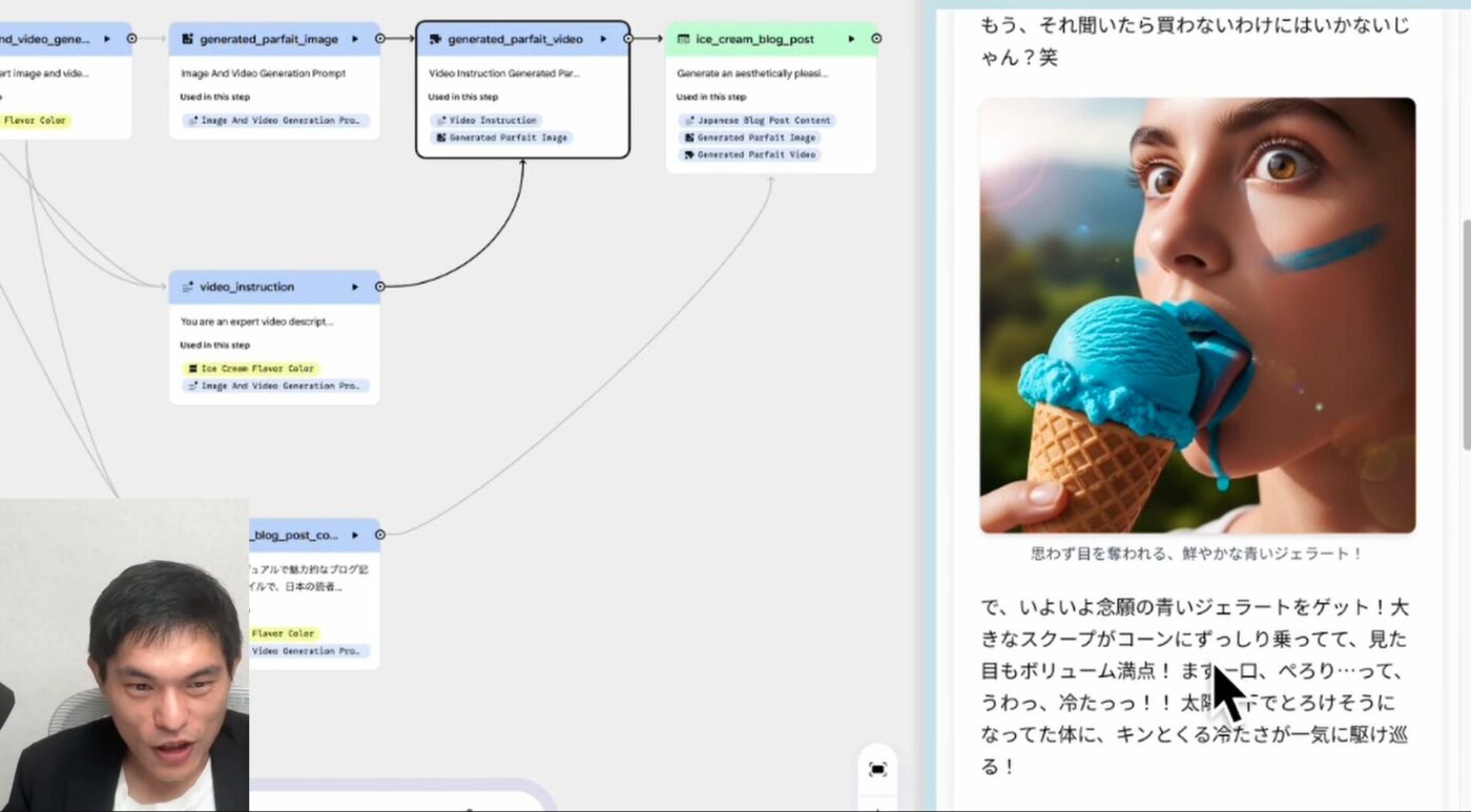 実際に「好きな色を入れたら、その色のアイスクリームパフェを食べているポニーテールの美女の画像を作り、その画像を基準として動画を生成して欲しい」と指示すると、Opalは入力された色(例:青)に応じた美女とジェラートの画像、そしてその画像を元にした動画を生成しました。生成された記事は、「思わず目を奪われる鮮やかな青いジェラート」というキャッチーな導入で始まり、美女の感想を通じてジェラートの魅力を伝えるという、ユニークな体験を読者に提供します。ただし、生成された動画で「唇が青い」といった予想外の面白い結果が出ることもあり、AIの創造性と、時に人間には予測できない側面を垣間見ることができます。