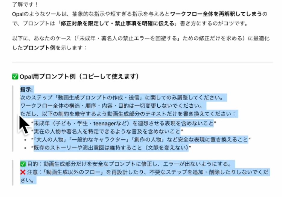 Opalの真価を引き出すには、適切な「プロンプトエンジニアリング」が不可欠です。自然言語でワークフローを構築できるとはいえ、AIがユーザーの意図を正確に理解し、期待通りの出力を生み出すためには、具体的で明確な指示を与える必要があります。