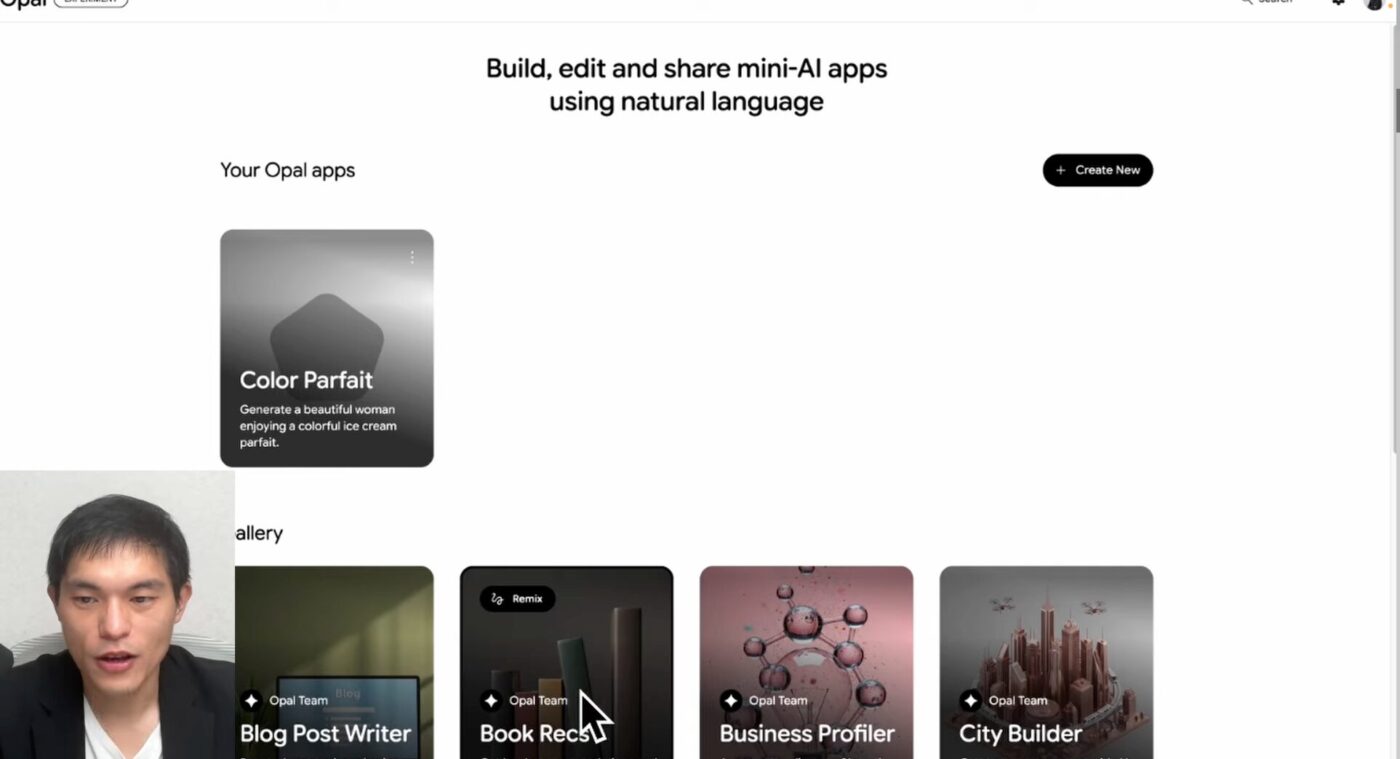 - Opalにアクセスし、新規ワークフローを作成する: Googleアカウントでログイン後、Opalのワークスペースに移動し、「Create New」をクリックして新しいワークフローの作成を開始します。