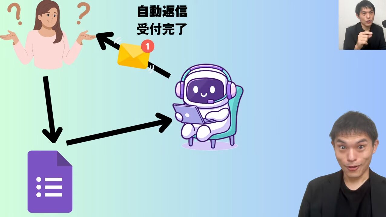 - 同時に、問い合わせ内容はGoogle Sheetsなどのスプレッドシートに自動的に記録されます。この記録には、問い合わせ日時、顧客の氏名、メールアドレス、問い合わせ内容などが含まれ、後続のAI処理や担当者による確認のために活用されます。