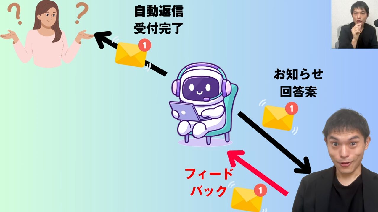 このプロセスは、AIが実際の業務を通じて継続的に学習し、知識を深化させていくことを意味します。これにより、システムの導入初期段階では人の介在が必要でも、運用を続けるうちにAIの回答精度が向上し、担当者の介入が最小限で済むようになるでしょう。結果として、問い合わせ対応業務はさらに効率化され、企業はより少ないリソースで質の高い顧客サポートを提供できるようになります。