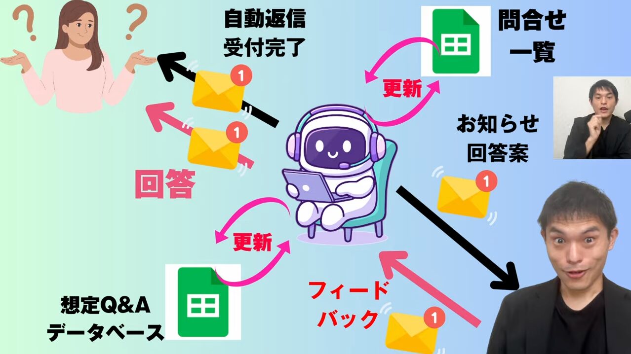 - Geminiは、あらかじめ設定された既存のQ&Aスプレッドシートやドキュメントを参照し、問い合わせ内容に合致する情報を基に、具体的な回答案を作成します。