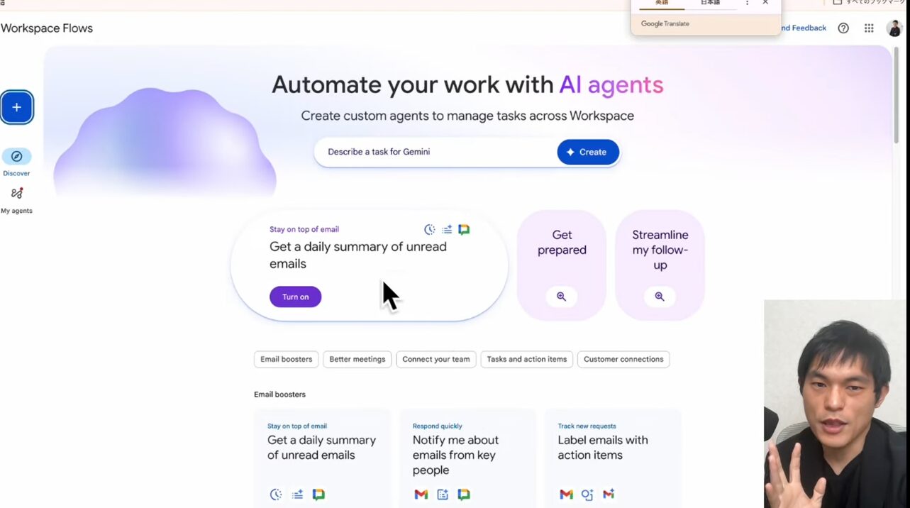 - 「My Flows」をクリックすると、Google Workspace Flowのワークスペースページに移動し、自動化エージェントの作成・管理を開始できます。