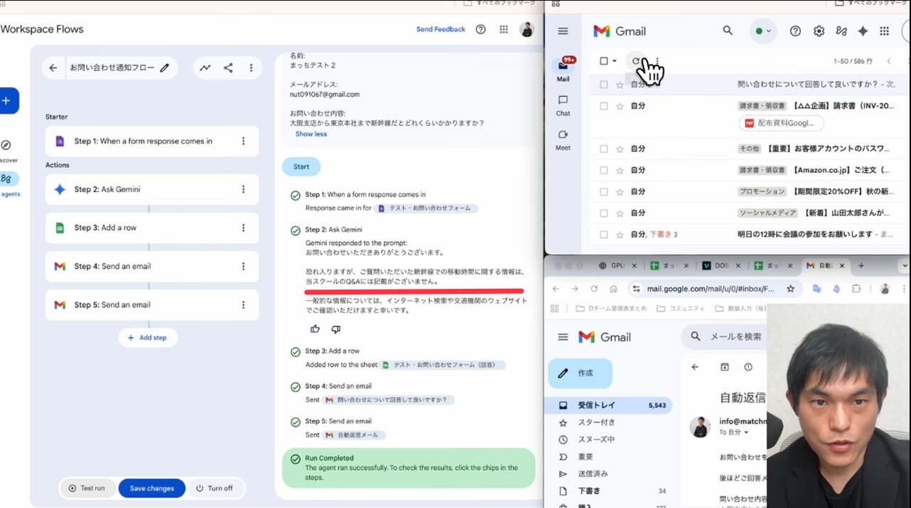 - 問い合わせ通知フロー: 顧客からの問い合わせを検知し、Geminiが回答案を作成、スプレッドシートを更新し、自動返信メールを送信するエージェント。