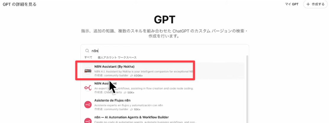 - n8n専用GPTsの起動: ChatGPTインターフェースから「n8n」と検索し、該当するGPTsを選択してチャットを開始します。