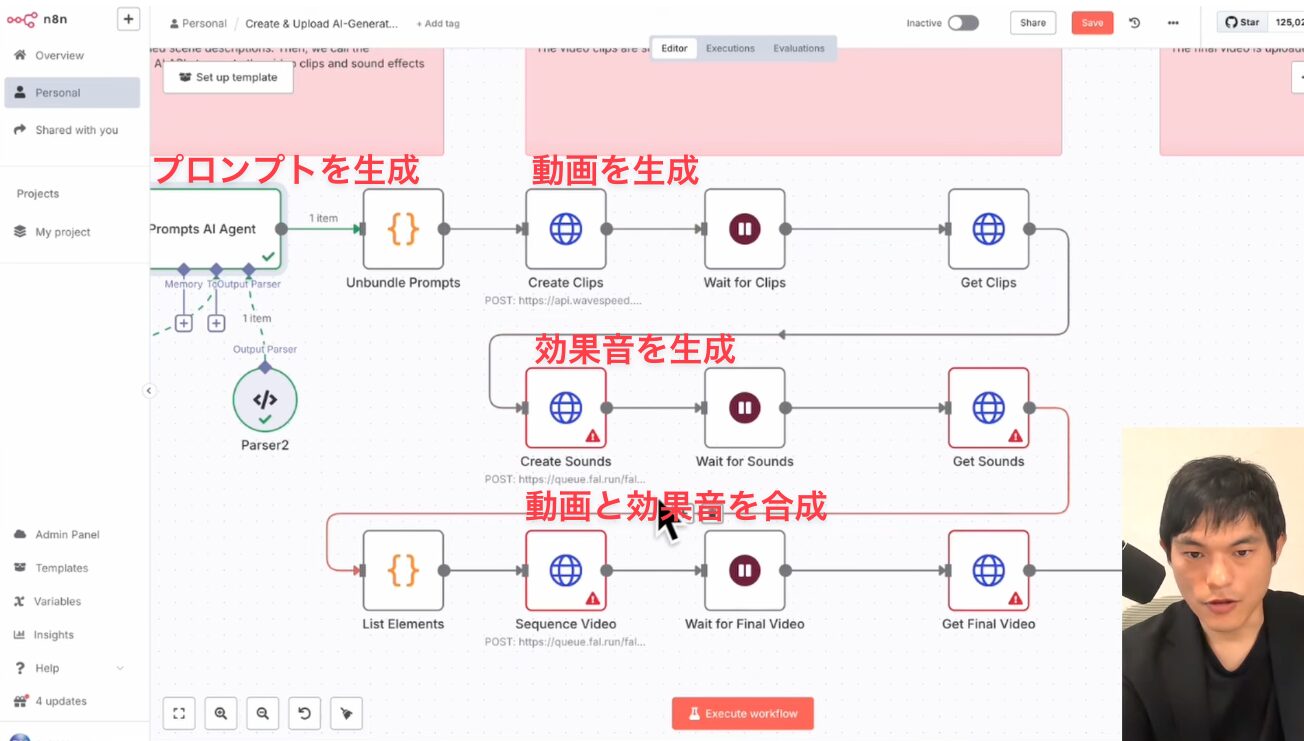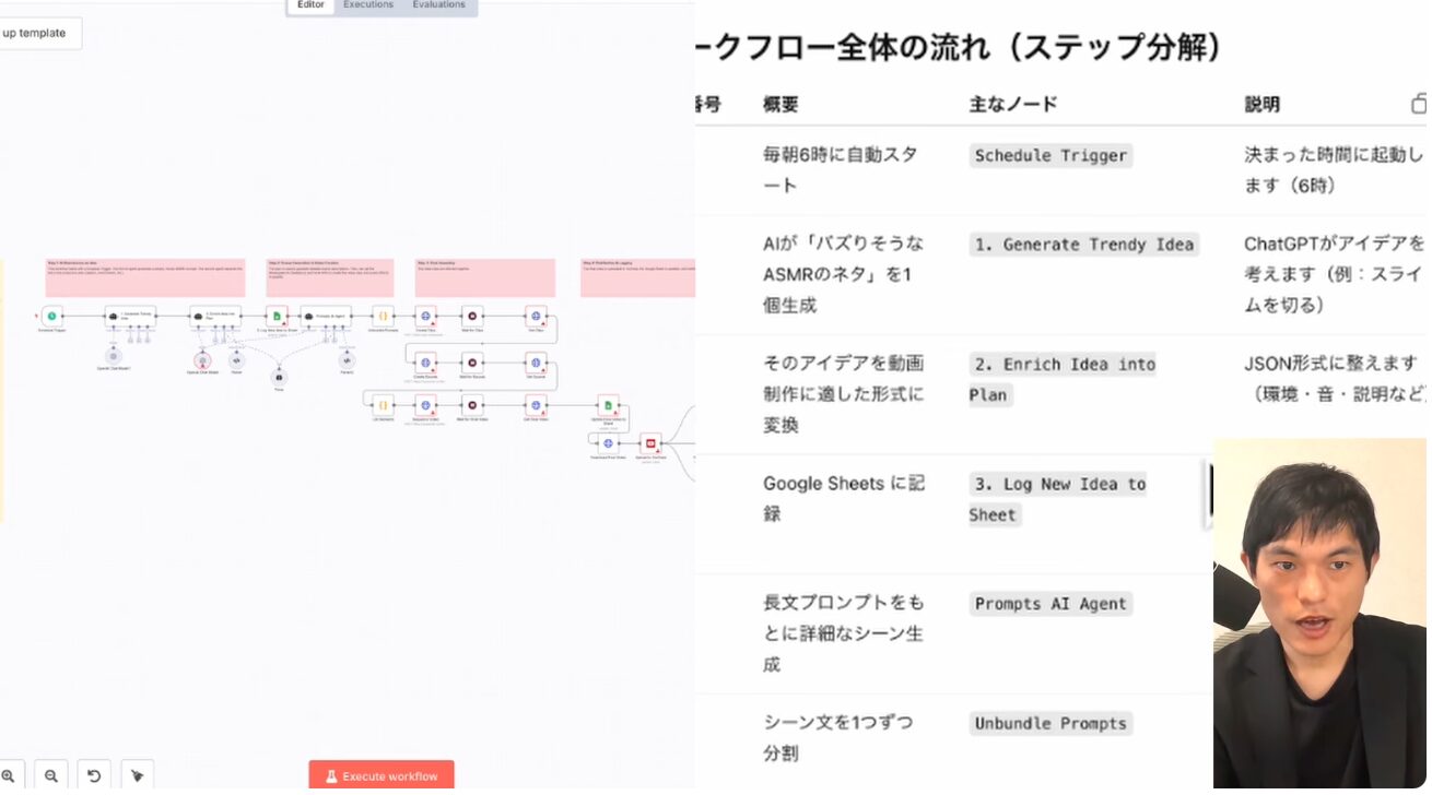 ここでは、実際にn8nを活用し、AIによるYouTubeショート動画コンテンツを自動生成するワークフローの構築と修正のプロセスを具体的に解説します。この事例を通じて、n8nテンプレートの活用方法とGPTsによるデバッグ・修正のノウハウを習得しましょう。