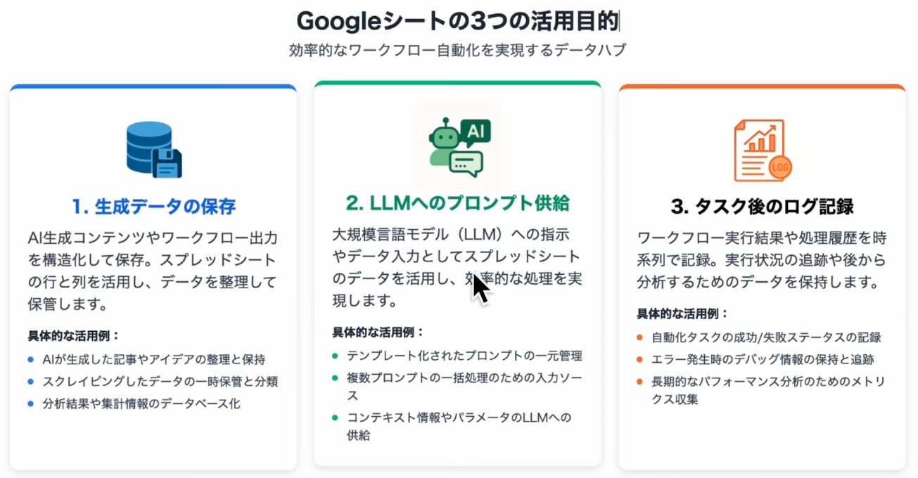 Googleスプレッドシートは、n8nワークフローにおけるデータの「ハブ」として極めて重要な役割を果たします。今回のワークフローにおけるGoogleスプレッドシートの主な利用目的は以下の3点です。