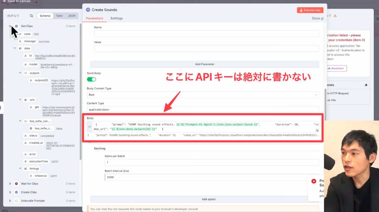 - 避けるべき入力場所: ワークフローの「Body」セクションや、直接プロンプト内にAPIキーを書き込むことは絶対に避けてください。これらの場所にAPIキーを記述すると、ワークフローのJSONコードが外部に漏洩した際に、APIキーも同時に漏洩するリスクが非常に高まります。悪意のあるユーザーがテンプレートを悪用し、意図的にAPIキーをbody部に書くように誘導する可能性も考えられます。