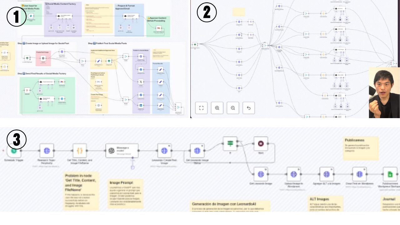 - ①多角的なコンテンツ作成と投稿: AIを活用し、X(旧Twitter)、Instagram、Facebook、TikTok、スレッズ、YouTubeショートなど、複数のプラットフォーム向けコンテンツを自動で作成し、投稿まで完結させるワークフロー。クリエイターやマーケターにとって、大幅な時間短縮と労力削減に繋がります。