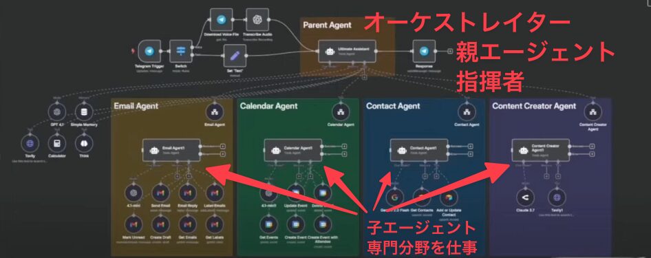 それでは、n8nを用いてマルチエージェントAIシステムを構築する具体的なステップを見ていきましょう。ここでは、親エージェントが子エージェントにタスクを委任し、特定の宛先にメールを送信するシンプルなシステムを例に解説します。