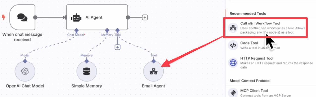 - ツール(Tools): 子エージェントが実行する具体的なタスクに応じたツールを設定します。例えば、メール送信エージェントであれば、「Email List」ツール(連絡先データベース、GoogleスプレッドシートやAirtableなどで管理)と「Gmail」ツール(Send Email機能)を接続します。これにより、メールアドレスの参照と実際のメール送信が可能になります。