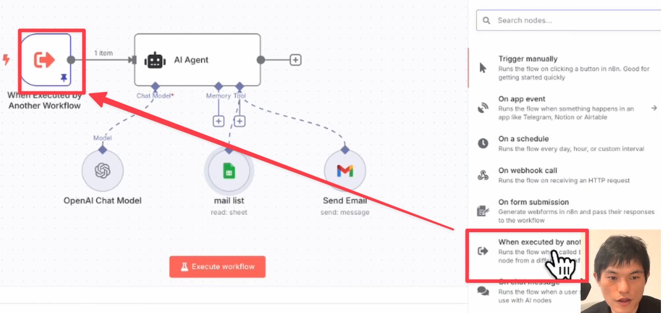 - トリガーノードの設置: 新規ワークフローを作成し、右クリックから「Add Node」を選択。「Add Another Trigger」カテゴリから「When executed by another workflow」ノードを設置します。このノードは、親エージェントから「Call n8n Workflow Tool」を通じて呼び出された際にワークフローを開始する役割を担います。
