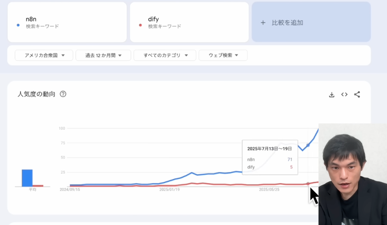 データを見ると、過去1年間におけるアメリカでの比較では、n8nがDifyを凌駕するほどの成長を見せています。これは、n8nが提供する豊富なノード(連携可能なアプリケーションの種類)と、AIエージェントとの連携による高度な自動化機能が、多様なビジネスニーズに応えている証拠です。日本国内での認知度はまだ低いものの、海外での成功事例は、今後日本にもn8nの波が確実に訪れることを示唆しています。