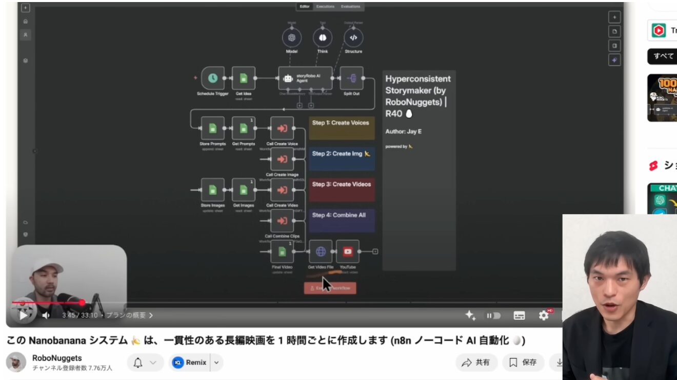 それでは、冒頭で紹介したような長尺AI動画を生成するワークフローが、n8n上でどのように構築されているのかを具体的に見ていきましょう。このシステムは、複数のAIエージェントとサービスが連携し、複雑な動画制作プロセスを自動化しています。海外のn8nYouTuber(RoboNuggetsチャンネル)のJayさんが作成したワークフローです。