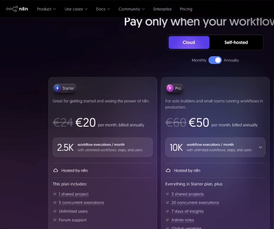 料金体系については、クラウド版では月額または年額で費用が発生しますが、通常は最初の一定期間(例えば14日間)無料で試用できる期間が設けられています。この無料期間を活用して、n8nの機能や操作感を体験してみることをお勧めします。また、年間料金を大幅に抑える方法も存在するため、利用を開始する前に調べてみる価値があります。