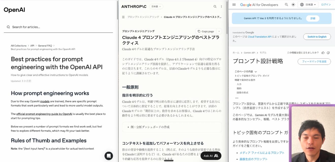 前述のベストプラクティスを全て自分で意識してプロンプトを作成するのは、慣れないうちは難しいかもしれません。しかし、心配はいりません。ChatGPTやClaudeといった生成AIは、これらのプロンプト作成の原則自体を理解しています。そのため、ユーザーは自身の目的と背景をAIに伝え、「この目的を達成するためのプロンプトを作成してください」と依頼すれば、AIがベストプラクティスに沿ったプロンプトを自動で生成してくれます。