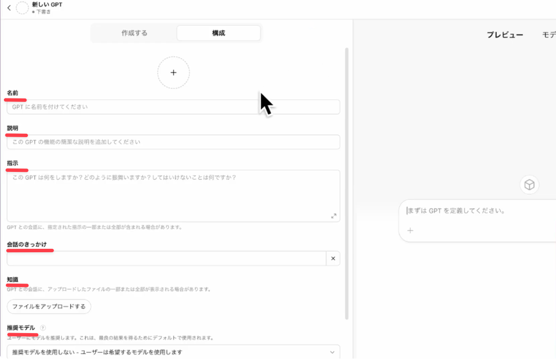 • カスタムGPT: 特定の指示や知識、機能を組み合わせて、自分だけのAIアシスタントを作成できる機能です。例えば、「メルマガライティングアシスタント」や「ブログ記事作成ボット」など、特定のタスクに特化させることが可能です。カスタムGPT作成時には、以下の項目を設定できます。