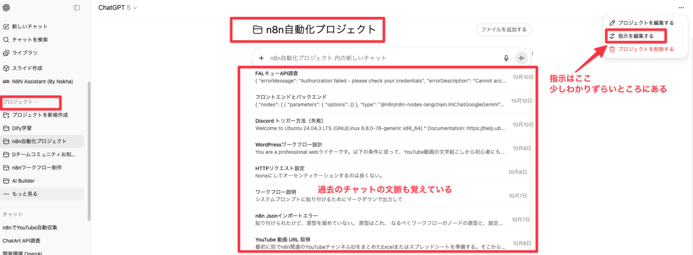 2. プロジェクトの指示: プロジェクト全体に適用されるメインプロンプトを設定します。これはカスタムGPTの指示に相当し、AIの基本的な振る舞いを定義します。