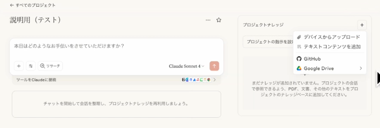 3. プロジェクトのナレッジ: Googleドライブ連携などを活用し、参照すべき追加情報をアップロードできます。Googleドキュメントを使用すれば、ドキュメントを更新するだけでプロジェクトのナレッジも常に最新の状態に保たれ、再アップロードの手間が省けます。