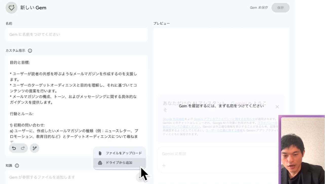 2. 知識(Knowledge): GoogleドライブからGoogleドキュメントなどを追加し、AIが参照すべき情報源を設定します。これにより、Gemはユーザーの提供した特定の知識に基づいて応答を生成できるようになります。