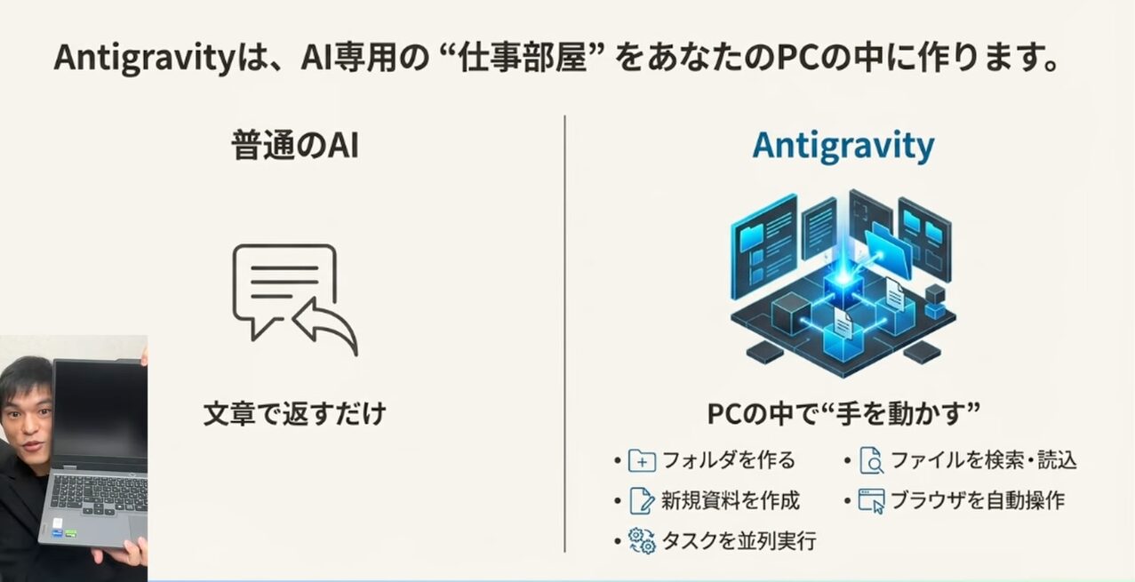 多くのビジネスシーンでAIが活用されるようになった今日、ChatGPTやGeminiのような文章生成AIは、私たちの業務を大きく変革しました。しかし、これらのツールは基本的に「指示されたテキストを生成する」という対話モデルに留まります。つまり、ユーザーが明確なプロンプトを与え、その結果としてテキスト出力が返されるのが一般的でした。しかし、Googleから新たに登場した「Antigravity」は、この従来のAIの枠組みを大きく超えるものです。単なるテキストの生成に留まらず、あたかも人間がパソコン上で作業するかのように、フォルダーの作成、ファイルの検索、既存資料の読み込み、そして新しい資料の生成・更新といった「実作業」を自律的に実行します。