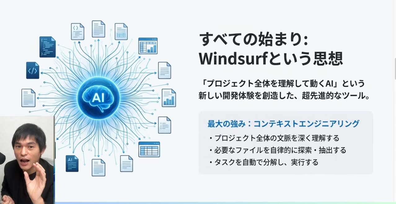 Windsurfの最大の強みは、その「コンテキストエンジニアリング」を極限まで強化した点にありました。従来のAIが人間の指示をただ受け取るだけだったのに対し、Windsurfは、プロジェクト全体の文脈を深く理解し、その上で必要なファイルを自ら探し出し、関連する箇所を抽出し、複雑なタスクを自動で分解します。そして、刻一刻と変化する状況を判断しながら自律的に行動するAIエージェントの開発を実現したのです。この「自律的に判断し、行動する」という点が、当時の他の駆動開発AIとは一線を画し、Windsurfが「抜群にすごい」と称された所以でした。