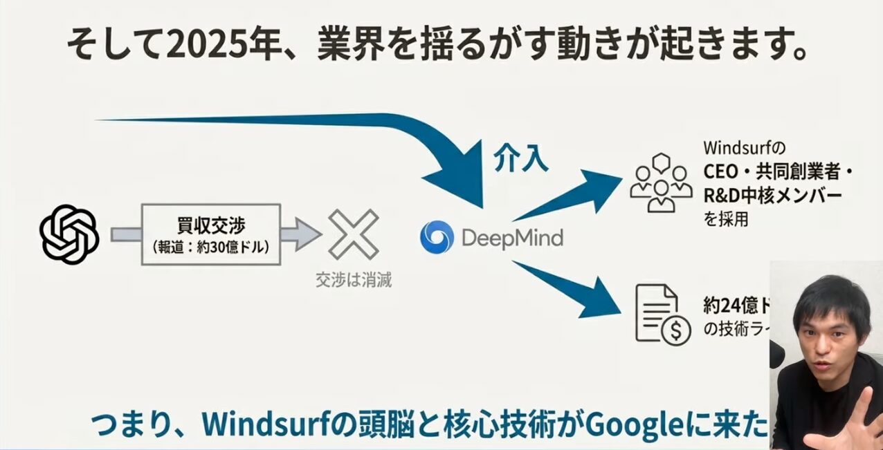 2025年、AI業界に衝撃的なニュースが走りました。Windsurfを巡る、OpenAIによる30億ドル規模の買収交渉が破談となったのです。そこに介入してきたのがGoogleのDeepMindでした。結果として、WindsurfのCEO、共同創業者、そして中核メンバーがごっそりとGoogleの傘下に入り、さらに約24億ドル規模の技術ライセンス契約が締結されました。こうして生まれたのがAntigravityです。