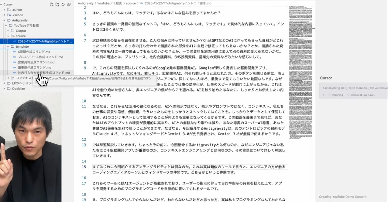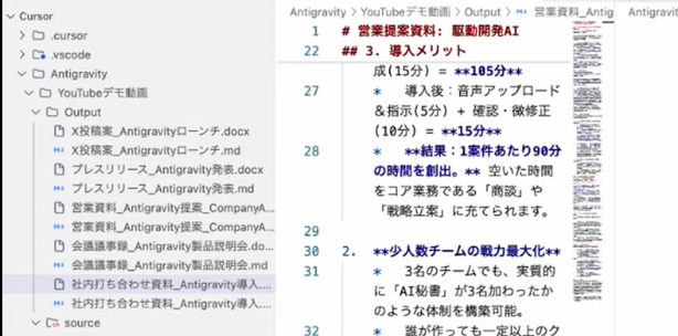 まず、手元にあるYouTube動画の文字起こしデータをAntigravityにインポートします。このデータは適当に話した内容を書き起こしただけの非常にラフなものです。AIエージェントに対し、「この文字起こしデータをもとに、YouTube動画のイントロ台本、社内導入資料、X(旧Twitter)へ投稿するための10個のテキスト案、そして営業用の提案資料を一度に作成し、アウトプットフォルダーに保存してください」と指示します。