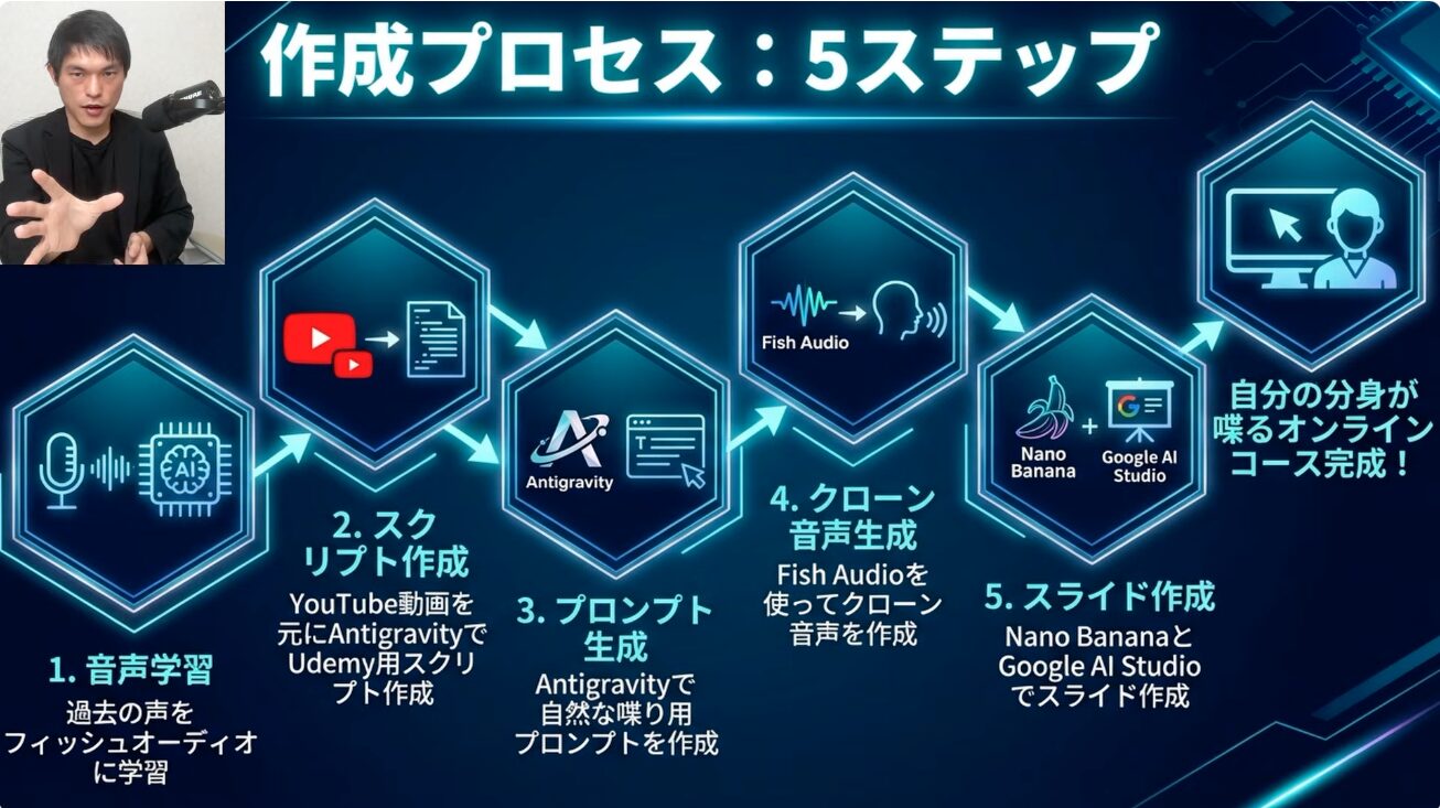 このクローン音声技術は、体調不良時だけでなく、ナレーションの声色を統一したい場合や、大量のコンテンツを効率的に生成したい場合にも非常に有効です。筆者の場合、このクローン音声で制作したオンラインコースが受講者から高い評価を得たことは、AI活用の可能性を強く裏付ける結果となりました。