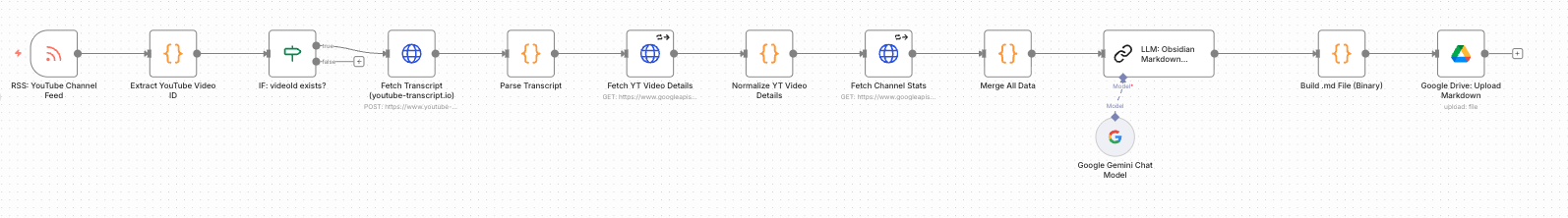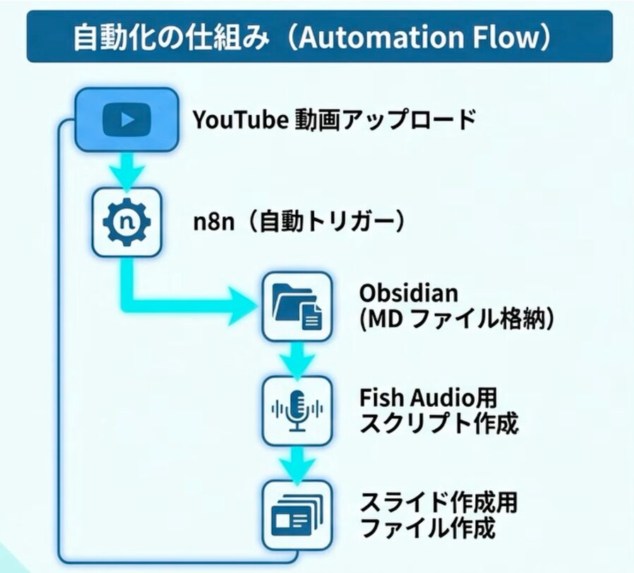 筆者はn8nを使い、自身のYouTube動画が公開されると同時に、その動画の音声を自動で文字起こしし、マークダウン形式で「Obsidian」という知識管理ツールに保存するワークフローを構築しています。この自動化により、過去の動画コンテンツがテキストデータとして蓄積され、新たなコンテンツ制作の貴重な「コンテキスト」となります。