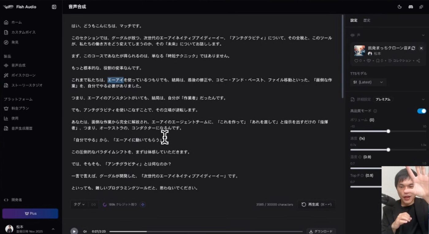 Fish Audioには「最も表現豊か」「感情サポート」といったオプションや、ボリューム、温度、トップP(Top P)などの調整機能があります。特に「トップP」を下げることで、AI特有の機械的な抑揚が抑えられ、より人間らしい自然な話し方に近づけることができます。何度か試行錯誤し、最適な設定を見つけることが高品質なクローン音声を生み出す鍵です。