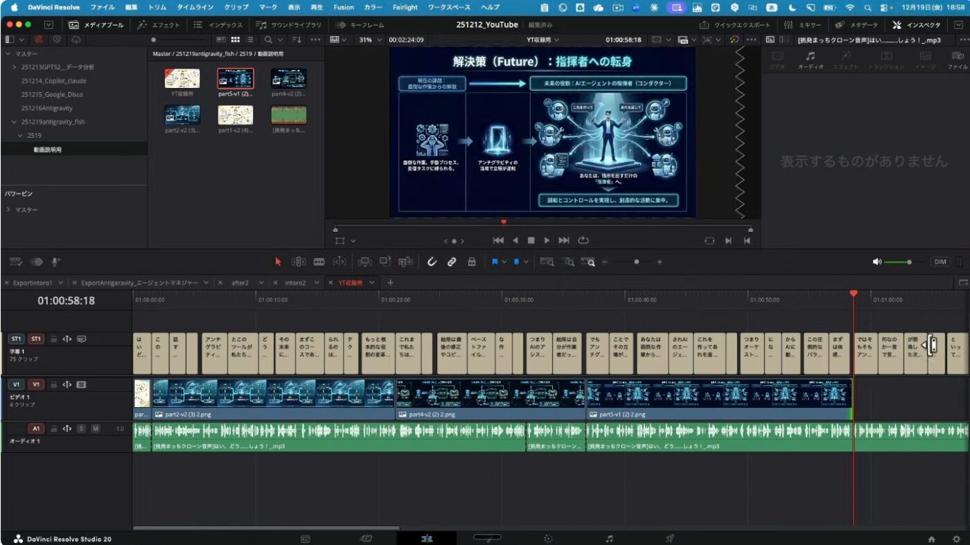 Fish Audioで生成したクローン音声ファイルと、Google AI Studioで作成したスライド画像をDaVinci Resolveにインポートします。これらの素材をタイムライン上に配置し、動画の基本的な構成を作り上げます。