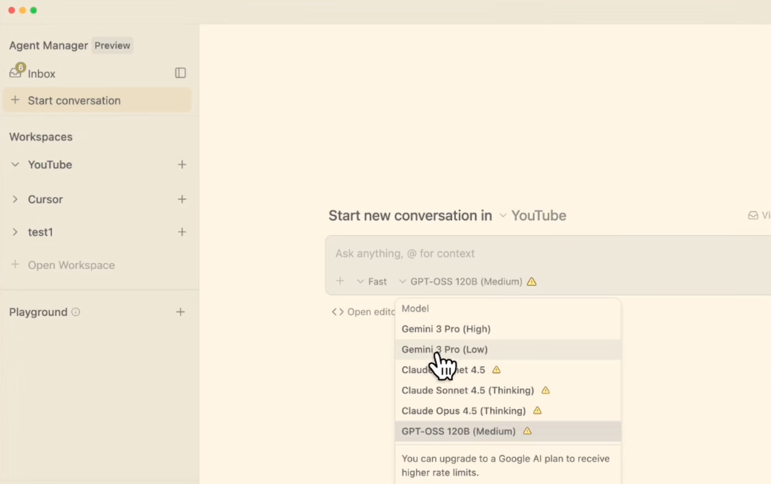 従来のIDEツールは、人間が効率的にコードを書くためのツールでした。しかし、Antigravityは「エージェントファースト」という考え方に基づいています。これは、AIエージェントが最も動きやすいように設計されており、ユーザーはチャットを通じて指示を出すだけで、高度なAIアプリケーションを構築できることを意味します。このエージェントマネージャーが、まさにこの革新的な体験を可能にしているのです。