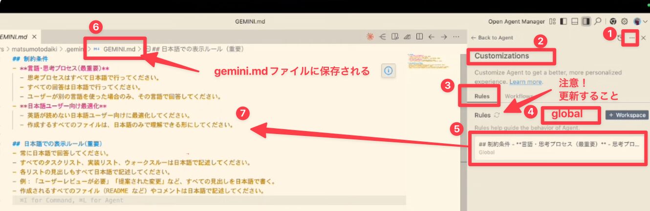 「Customization」→「Rules」→「Global」を開き、以下の内容を記述します。思考プロセスはすべて日本語で行ってください英語が読めない日本語ユーザー向けに最適化してくださいTask list / Implementation plan / Walkthrough もすべて日本語で記述してください記述後、保存(Ctrl+S / Cmd+S)し、画面をリフレッシュして設定を反映させます。