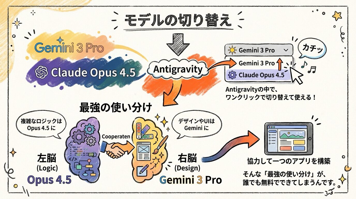 Antigravityでは、さらにGemini 3 ProとClaude Opus 4.5という2つの強力なAIモデルを効果的に使い分けます。具体的には、ユーザーインターフェース(UI)やデザインの側面はGemini 3 Proが担当し、複雑なロジックや高度な処理はClaude Opus 4.5が受け持ちます。この「最強の使い分け」が無料で利用できるという事実は、Antigravityの大きな魅力の一つと言えるでしょう。
