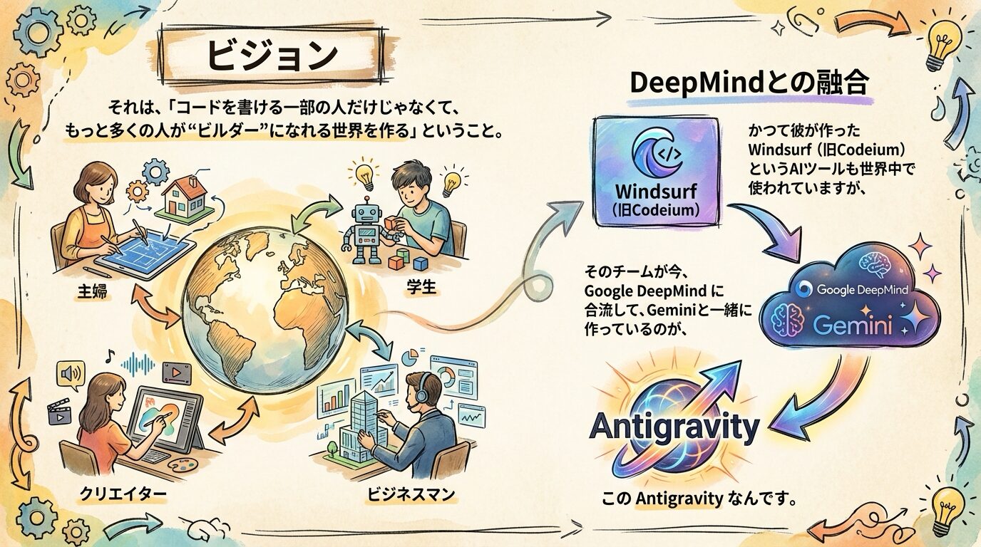 Antigravityの開発メンバーには、かつてアメリカのトップレベルのテック企業で活躍したエンジニアが含まれています。彼らの信念は「コードを書ける一部の人だけでなく、もっと多くの人、いや全人類がビルダーになれる世界を創造する」というものでした。この思想がGoogleの方向性と合致し、現在はGeminiと共にGoogleの傘下でAntigravityの開発が進められています。この背景があるからこそ、Antigravityは「プログラミングなんて無理」と考えている非エンジニアに徹底的に寄り添った設計となっているのです。
