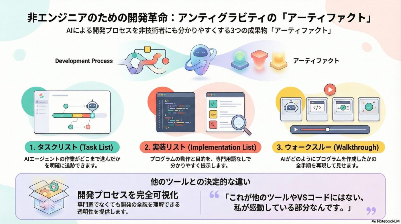 Antigravityはプロンプトを受け取ると、AIエージェントが自律的に思考し、主に以下の3つの「Artifacts」を生成します。