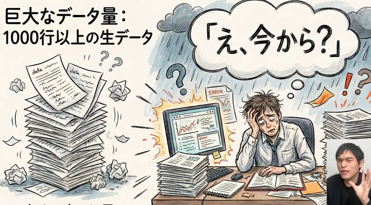 例えば、何千行にも及ぶ生データが詰まったExcelファイルを前に、「どこから手をつければいいのか分からない」「ピボットテーブルやVBAの知識が足りない」といった悩みを抱える人は少なくありません。これらの作業は高度なExcelスキルを要求され、習得には時間がかかります。結果として、データ整理や分析に追われ、本来の業務である売上向上や新たな企画立案に時間を割けない「本末転倒」な状況に陥りがちです。