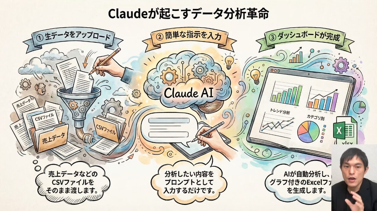 それでは、具体的な手順を見ていきましょう。Claude 4.5 Opusを使って、金曜の夜に渡された膨大な売上生データから、月曜の朝までに完璧なExcel分析レポートを作成するプロセスを解説します。