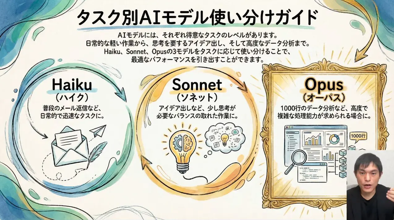 - Sonnet(ソネット):バランスの取れた性能を持ち、Haikuよりも複雑なタスクや中程度のデータ処理に対応します。本記事で後述する「方針検討」のような、初期段階の思考プロセスを任せるのに適しています。