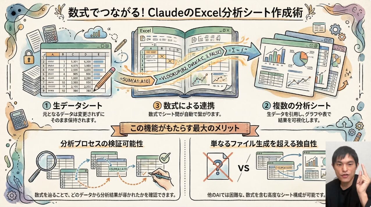 - この一文が非常に重要です。この指示がないと、数値は入っていても数式のないExcelファイルが生成され、後から分析過程を追跡したり、データを更新したりすることが困難になります。