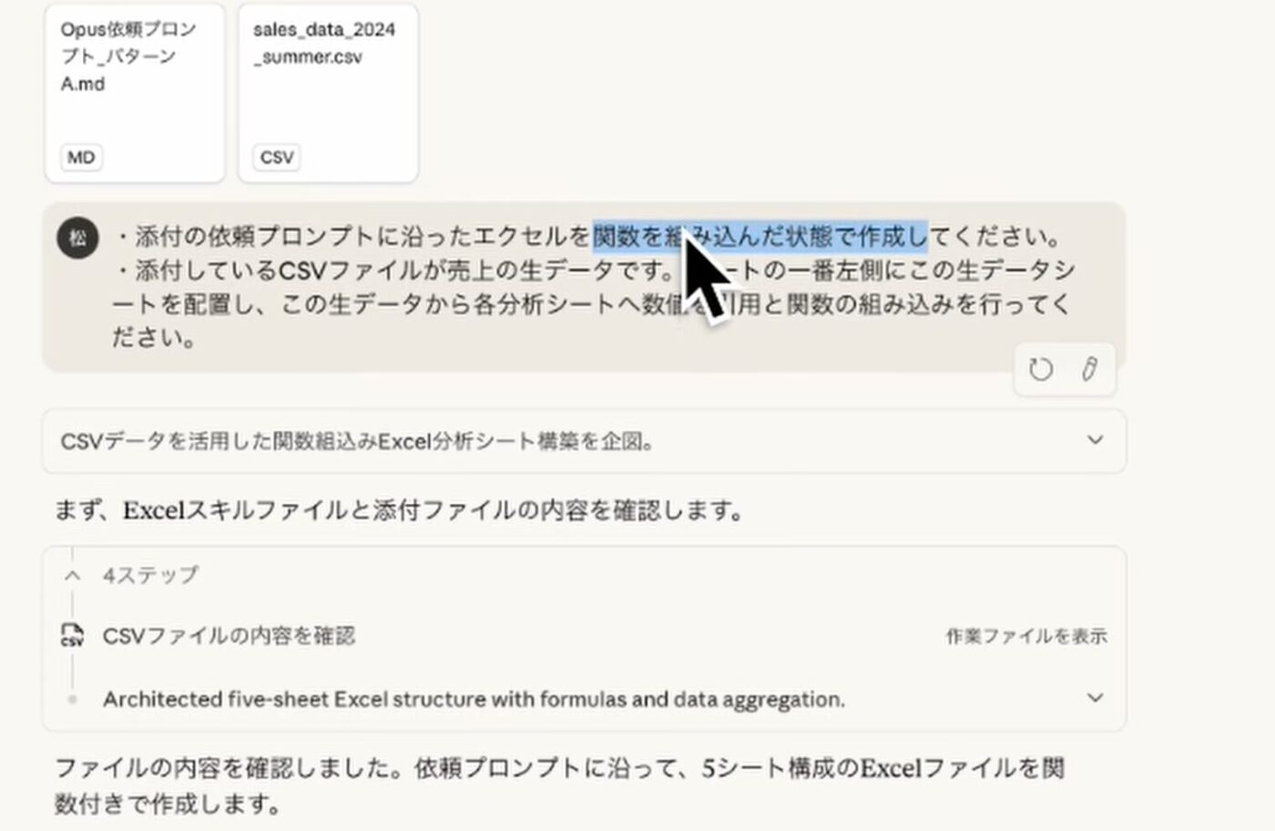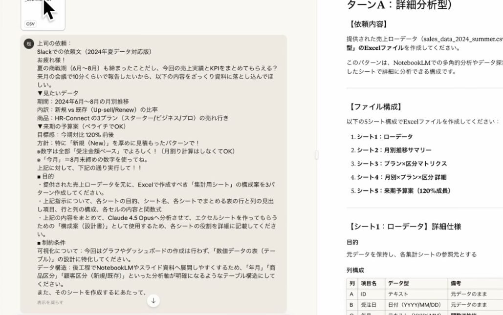 Sonnetが生成したプロンプト(Markdownファイル)と、最初の生データCSVファイルを新規チャットでOpus 4.5にアップロードします。ここで最も重要なプロンプトの指示は以下の通りです。