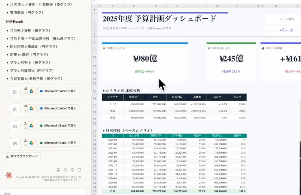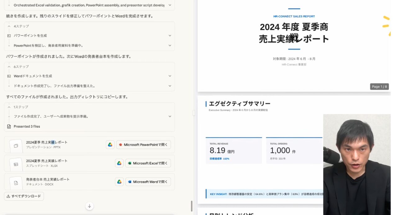 データ分析の最終的なアウトプットは、Excelファイルだけにとどまりません。Claude 4.5 Opusは、分析結果を基に、Word形式の報告書やPowerPoint形式のプレゼン資料まで一貫して自動生成することが可能です。