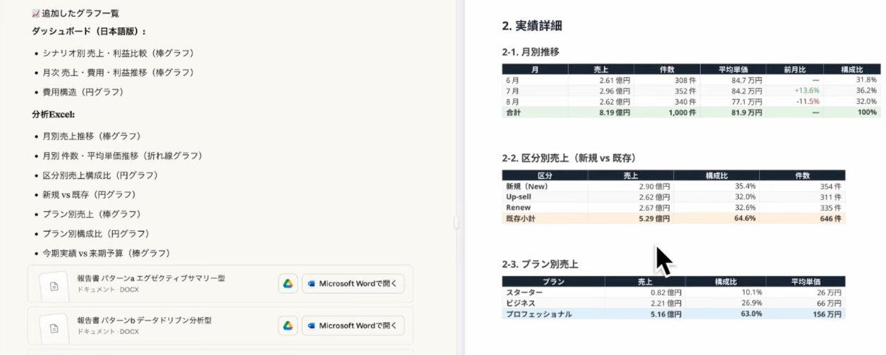 選んだパターンに基づいて、「Wordを作成してグラフも入れてビジュアル化してほしい」と指示すれば、データ分析に基づいた客観的な考察や提案、グラフが組み込まれたプロフェッショナルなWord報告書が自動生成されます。これは、単なる数値の羅列ではなく、意味のあるストーリーと洞察が込められた高品質なドキュメントです。